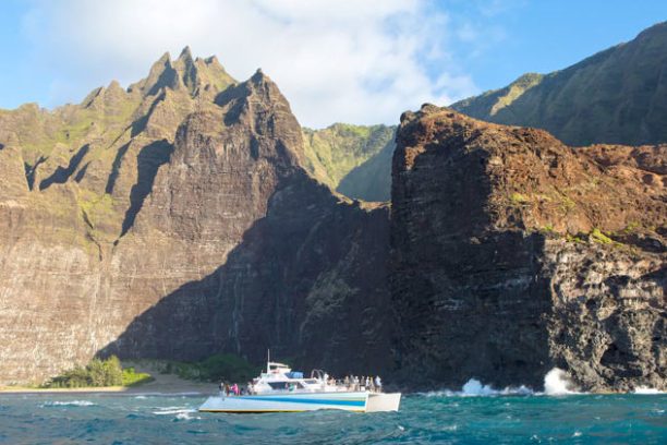 You’ll enjoy a continental-style breakfast as you cruise along Kauai’s arid & beachy westside and towards the world-renowned Napali Coast. Your Captain will narrate the journey with history, legends, stories, and information about the island as you travel further north and get into the heart of Napali where you’ll witness her 4,000-foot sea cliffs, sea caves, sea arches, deep, rich emerald valleys, distant mountain waterfalls, up-close waterfalls that splash right into the bright blue ocean, serene beaches, glowing rainbows, light, shadows, mists, and all the other amazingness that’s somehow different and somehow magical every single day, without fail.