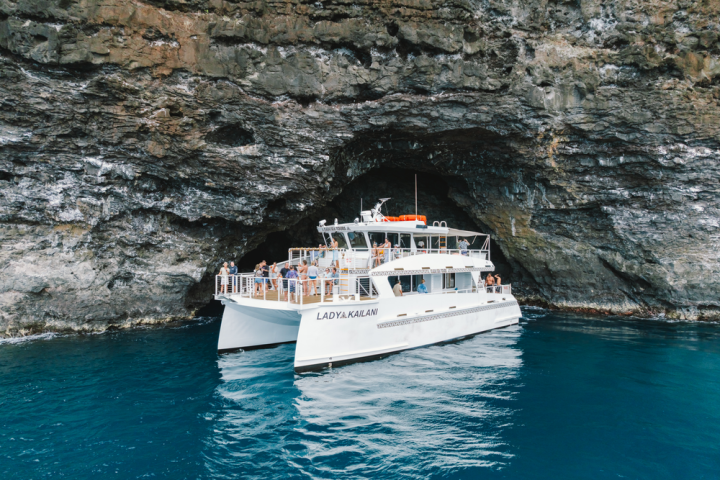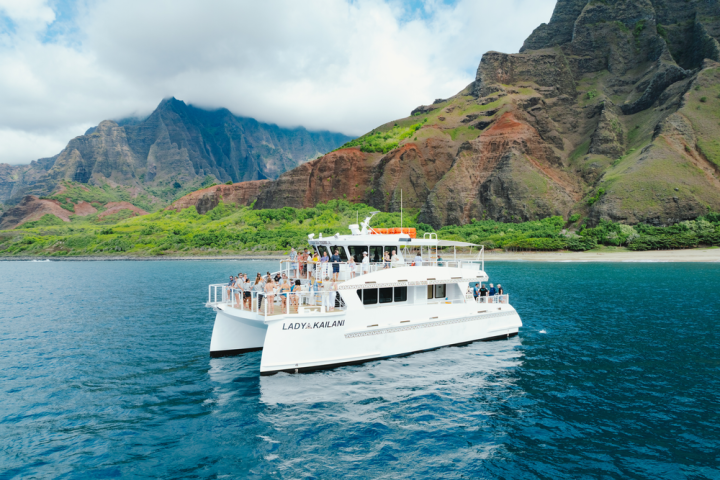 Indulge in an afternoon on the breathtaking Nā Pali Coast aboard the brand new 65-foot luxury catamaran, Lady Kailani. Begin your adventure with a splash, snorkel in warm tropical waters, plunge down twin water slides, or step right into the sea from the hydraulic swim platform. All gear, instruction and safety equipment are provided, so all you have to do is enjoy.