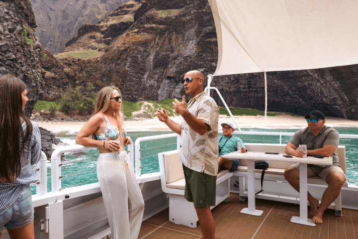 Keep an eye out as dolphins, sea turtles, and even seasonal humpback whales may make an appearance. With 360° views, custom sunshades, and plenty of space to unwind, this afternoon cruise offers the perfect mix of comfort, romance, and Kauai magic.