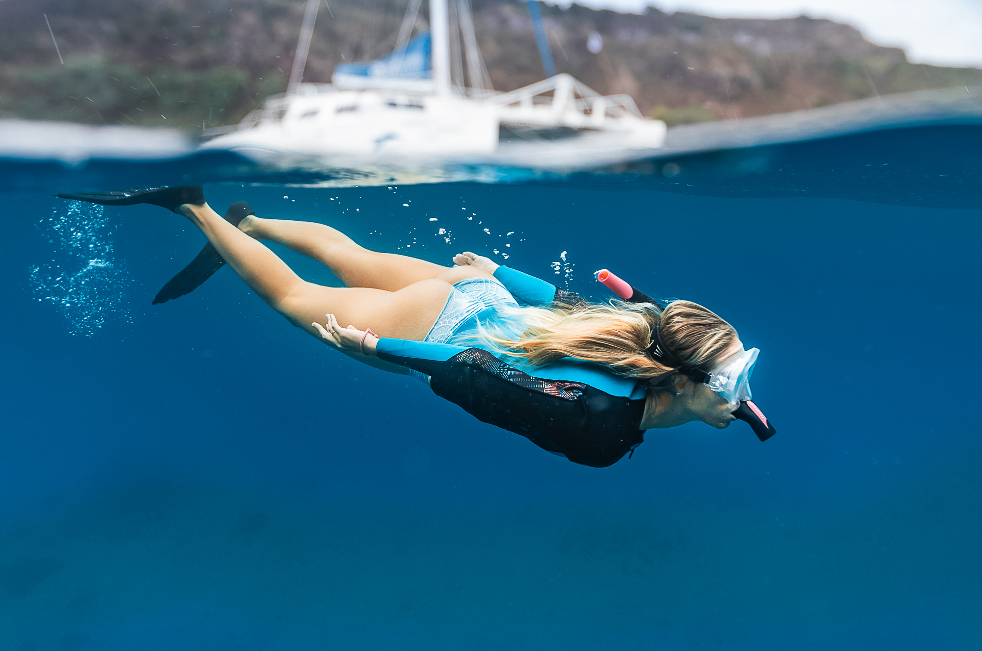 Start the adventure with a snorkel in Maui’s crystal-clear leeward waters, where you might find yourself swimming alongside sea turtles, vibrant tropical fish, and colorful coral reefs. With a marine naturalist onboard, you’ll learn fascinating facts about the ocean and the incredible marine life you’ll encounter.