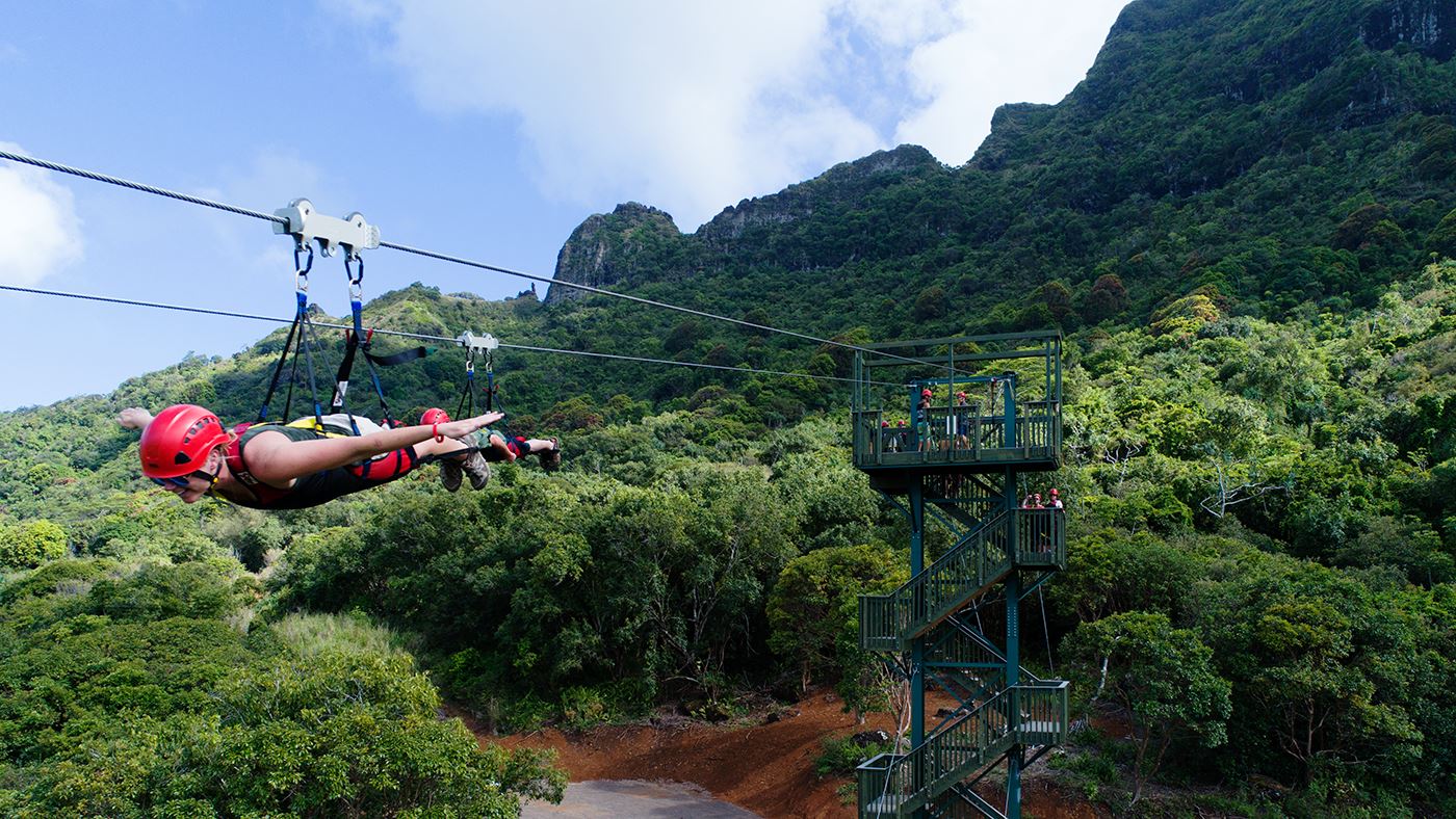Enjoy some high-altitude smiles while soaring above towering trees, through the forest canopy and high above rivers and waterfalls. Take in the amazing views of Kipu Ranch, with its beautifully diverse terrain made famous in movies like Jurassic Park, Pirates of the Caribbean, Raiders of the Lost Ark, and the Descendants.